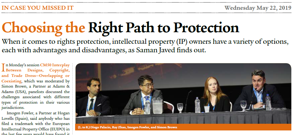 5月20日、集佳のシニアパートナー弁護士である趙雷氏はINTAの招待を受け、「意匠、著作権、トレードドレスの相互作用と相互影響」をテーマに、INTA第141回年次総會のメイン會場にて基調講演を行った。趙氏は南アフリカ、アメリカ、アルゼンチン、スペインの知的財産の専門家と共にパネリストとして、世界の各主要地域の意匠、著作権、トレードドレスなどのさまざまな知的財産に関する保護戦略と実務の問題について意見交換、議論を行った。また、趙氏は、インドと日本の保護の仕組み、そしてそれが中國の狀況と極めて似ていることを紹介した。また、トレードドレスの保護について、中國、インド、日本のいずれの國でも、知的財産権の権利者は立體商標、著作権、意匠など複數の保護手段があり、各権利の長所と短所を踏まえて、最も優れた保護効果を実現すべきである旨を指摘した。