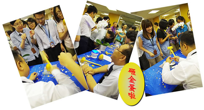 特別布置的活動主會場,同樣在藍色與白色的交融中,詮釋著節日的歡樂。而為慶典特別設計的“砸金蛋、贏大獎”活動,則充滿挑戰和趣味,吸引了眾多同事的響應和參與——尋找金蛋的過程充滿了欣喜和快樂,金蛋里的問題讓我們重溫集佳成長歷程,而金蛋中的大獎,則帶給大家一份驚喜和幸運,共同分享集佳18周年慶典的喜悅?;顒蝇F場氣氛熱烈、高潮跌宕,同事們紛紛合影留念,定格這美好瞬間。