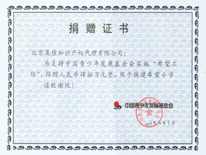 作為目前中國最大的知識產(chǎn)權(quán)服務(wù)機(jī)構(gòu)之一,集佳知識產(chǎn)權(quán)代理有限公司在自身穩(wěn)健發(fā)展的同時(shí),積極承擔(dān)著企業(yè)的社會責(zé)任。自2004年起,集佳與中國青少年發(fā)展基金會合作,積極參與“希望工程”捐建希望小學(xué)活動(dòng)。截至2009年10月,集佳已捐款一百五十余萬元,援建了彪池村集佳希望小學(xué)、陸廟村集佳希望小學(xué)、韓營村集佳希望小學(xué)、清風(fēng)嶺集佳希望小學(xué)和清泉集佳希望小學(xué),圓了近萬名學(xué)齡兒童的求學(xué)夢想。集佳正在用行動(dòng)兌現(xiàn)最初的承諾:“每年建一所集佳希望小學(xué)!”