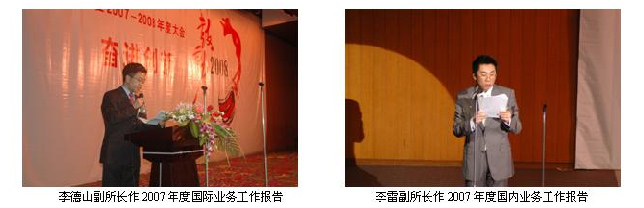 在振奮的年會開場后,集佳李德山副所長和李雷副所長分別作了2007年度國際業務和國內業務工作報告。2007年集佳商標申請量持續七年保持國內第一,進口、出口商標代理量繼續快速增長,出口專利量仍保持中國最大的成績再一次印證了集佳扎實、穩健、持續、快速的發展歷程,讓在場的每一個集佳人感到驕傲和振奮。而合伙人和初級合伙人的逐步增加,擁有了國內最頂尖的電學代理人團隊以及管理團隊的高效運轉,更讓我們看到,集佳的理念和發展前景吸引了越來越多的精英共創偉業。