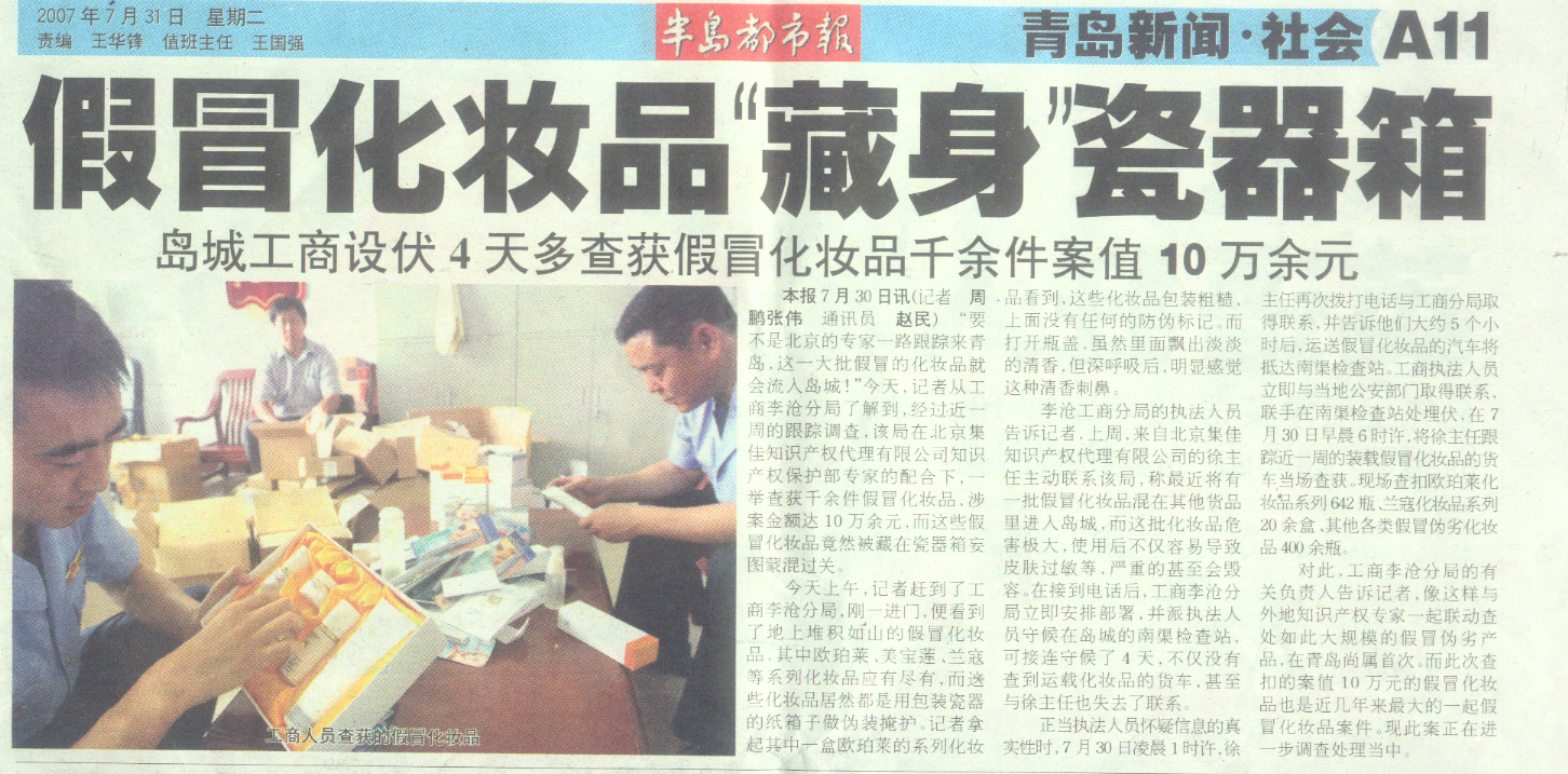 青島市工商李滄分局的有關(guān)負(fù)責(zé)人說:“要不是北京的專家一路跟蹤來青島,這一大批假冒的化妝品就會(huì)流入島城。像這樣與外地知名知識(shí)產(chǎn)權(quán)專家一起聯(lián)動(dòng)查處如此大規(guī)模的假冒偽劣產(chǎn)品,在青島尚屬首次。” 此次查扣的案值10萬元的假冒化妝品也是近幾年來青島最大的一起假冒化妝品案件。現(xiàn)此案正在進(jìn)一步調(diào)查處理當(dāng)中。