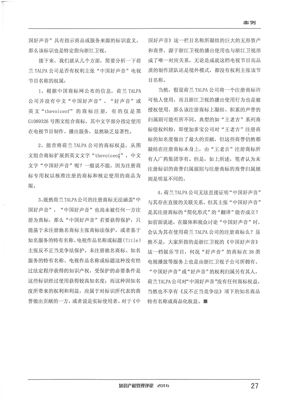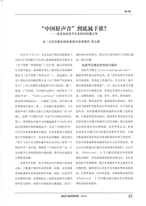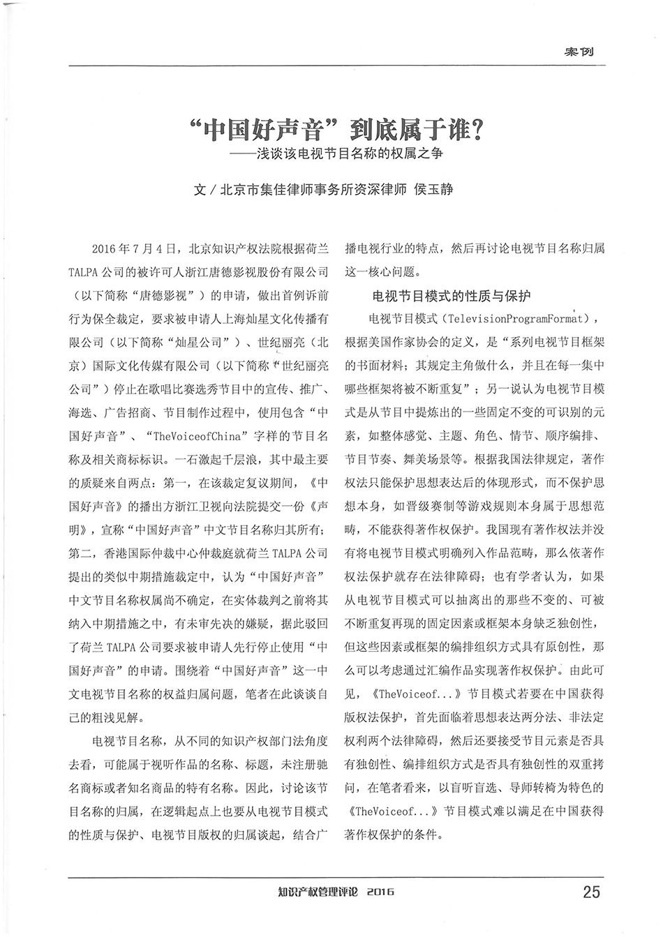 集佳資深律師侯玉靜文章《“中國好聲音”到底屬于誰?——淺談該電視節(jié)目名稱的權屬之爭》在《知識產權管理評論》發(fā)表