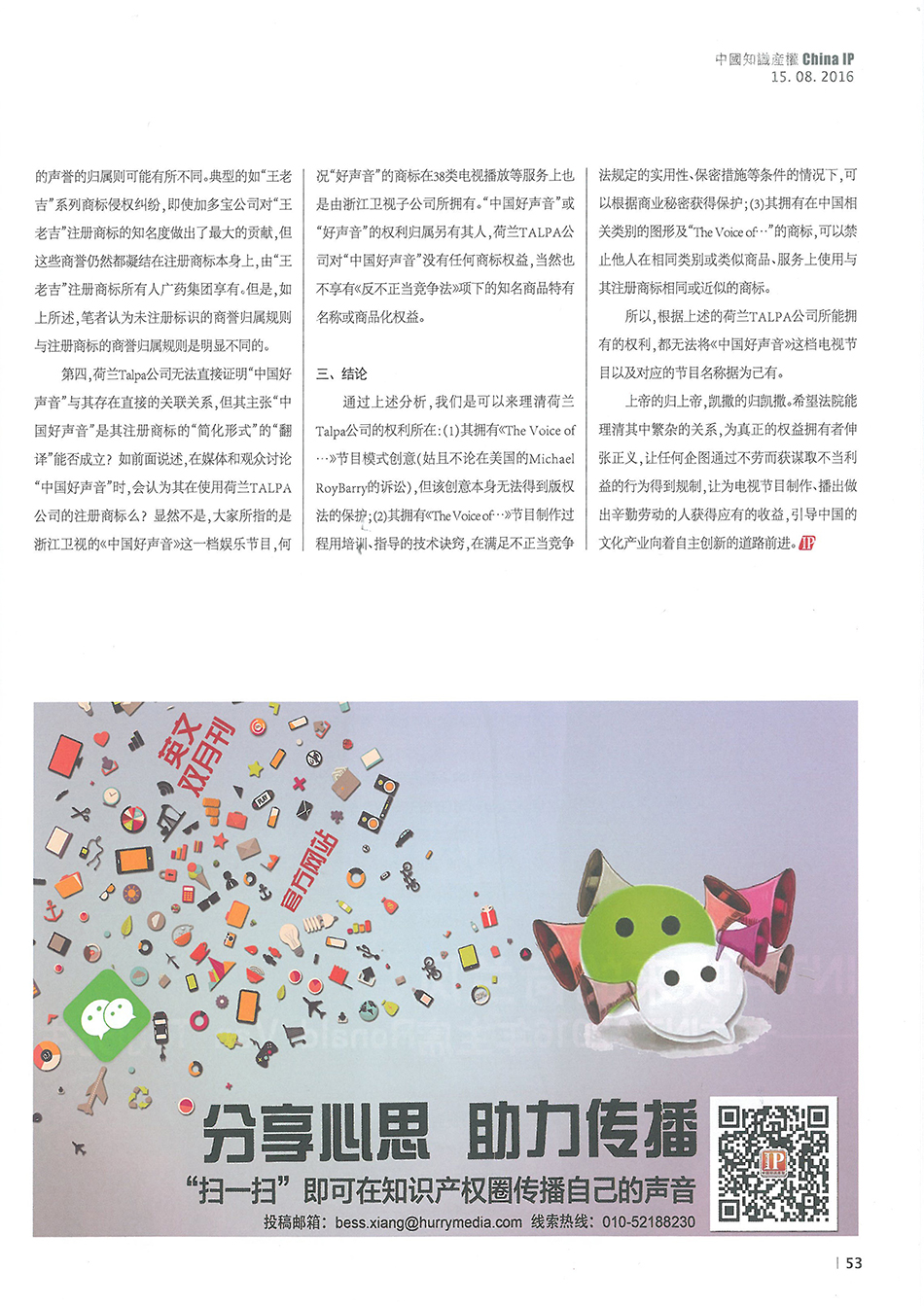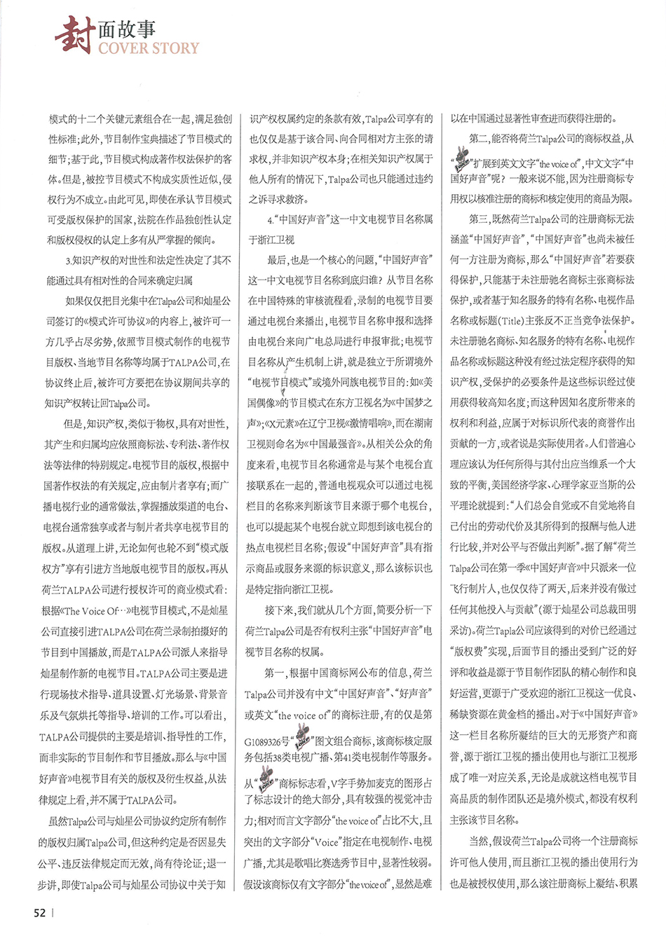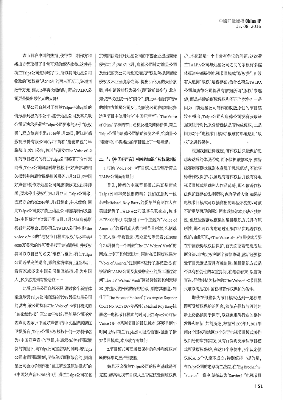 集佳資深律師侯玉靜文章《“中國好聲音”到底屬于誰?——淺談該電視節目名稱的權屬之爭》在《中國知識產權》發表