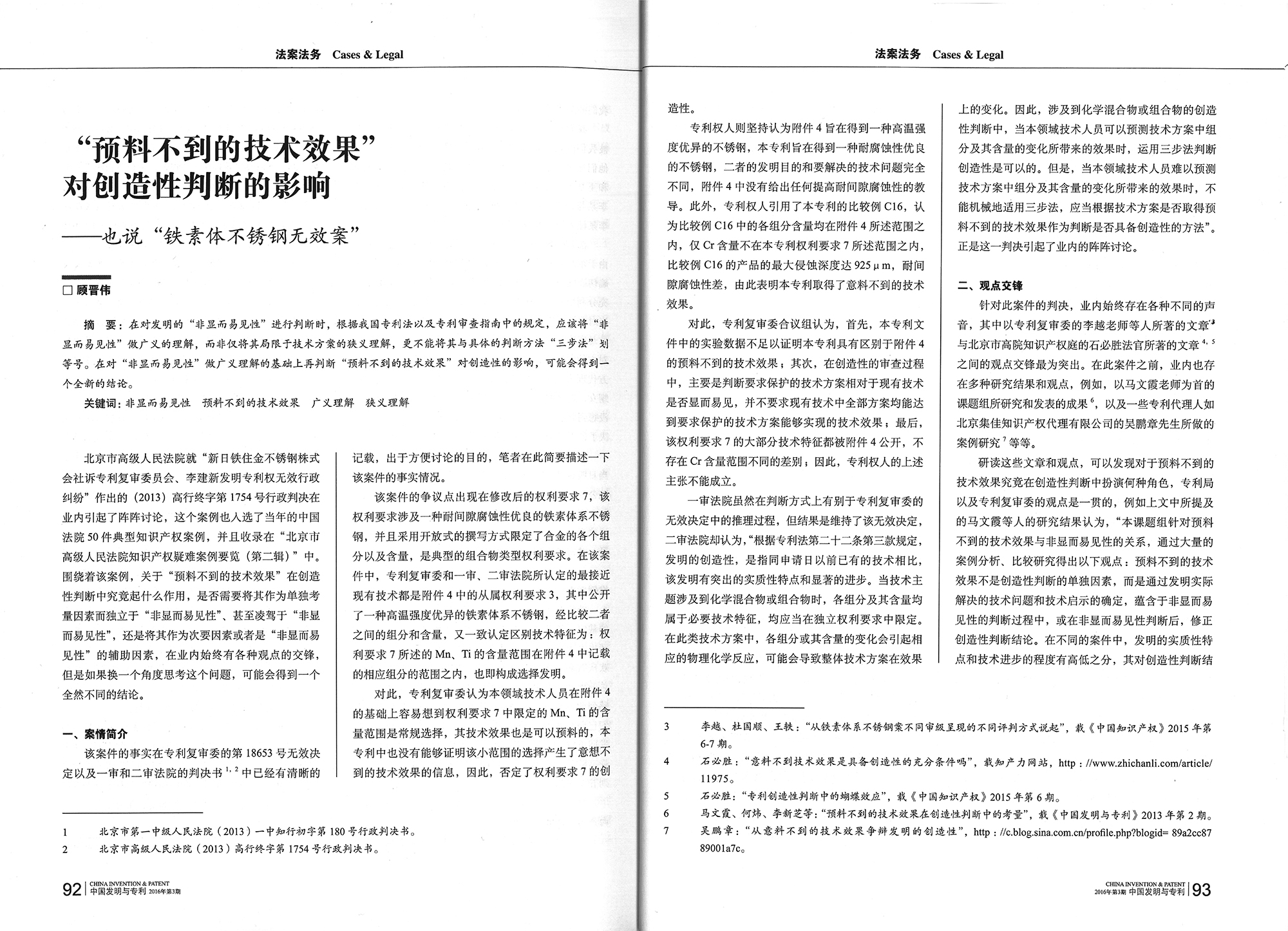 集佳代理人文章《“預料不到的技術效果”對創造性判斷的影響--也說鐵素體不銹鋼無效案》在《中國發明與專利》發表
