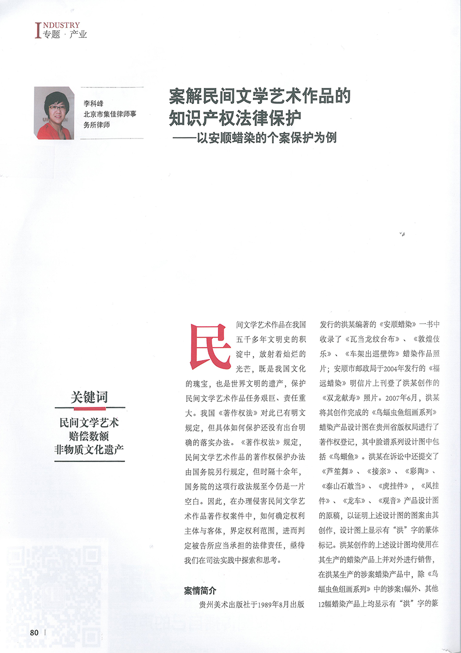 集佳律師李科峰文章《案解民間文學藝術作品的知識產權法律保護——以安順蠟染的個案保護為例》在《中國知識產權》發表