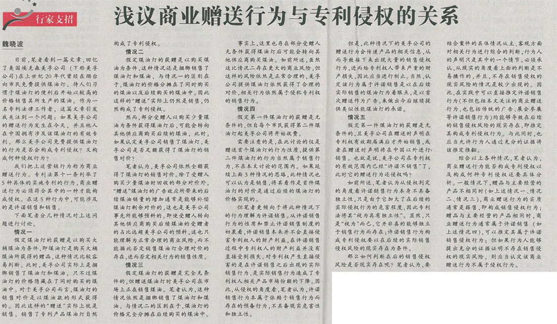 集佳代理人撰文《淺議商業(yè)贈(zèng)送行為與專(zhuān)利侵權(quán)的關(guān)系》在《中國(guó)知識(shí)產(chǎn)權(quán)報(bào)》發(fā)表