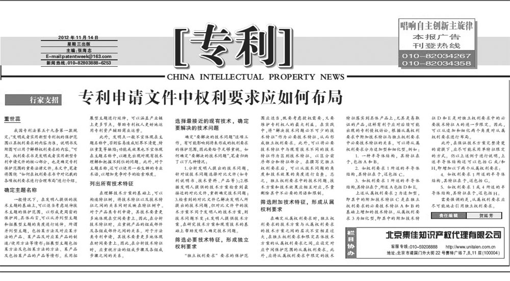 《中國知識(shí)產(chǎn)權(quán)報(bào)》:專利申請(qǐng)文件中權(quán)利要求應(yīng)如何布局
