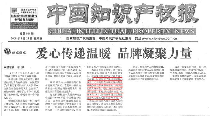 《中國知識產(chǎn)權(quán)報(bào)》:愛心傳遞溫暖 品牌凝聚力量