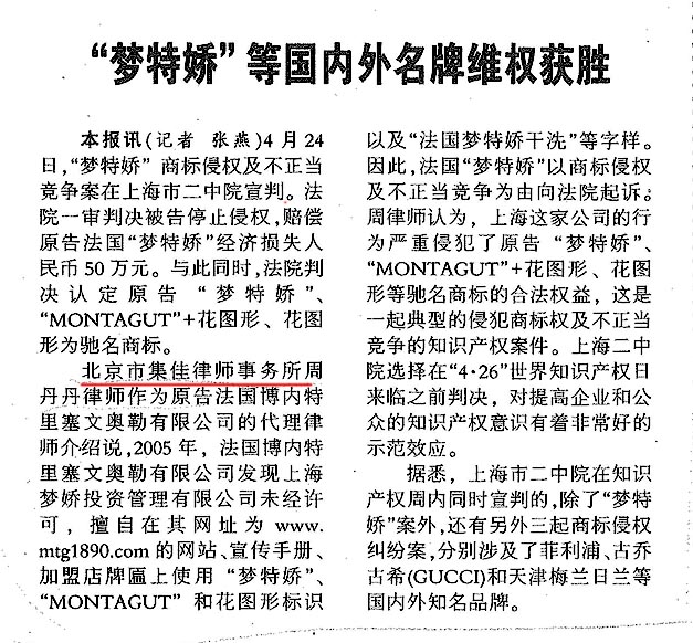 《名牌時報》:“夢特嬌”等國內(nèi)外名牌維權(quán)獲勝
