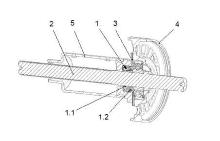 1-環狀彈簧元件;1.1-內部的作用區域;1.2-外部的作用區域;2-軸;3-轂; 4-軸承架;5-殼體
