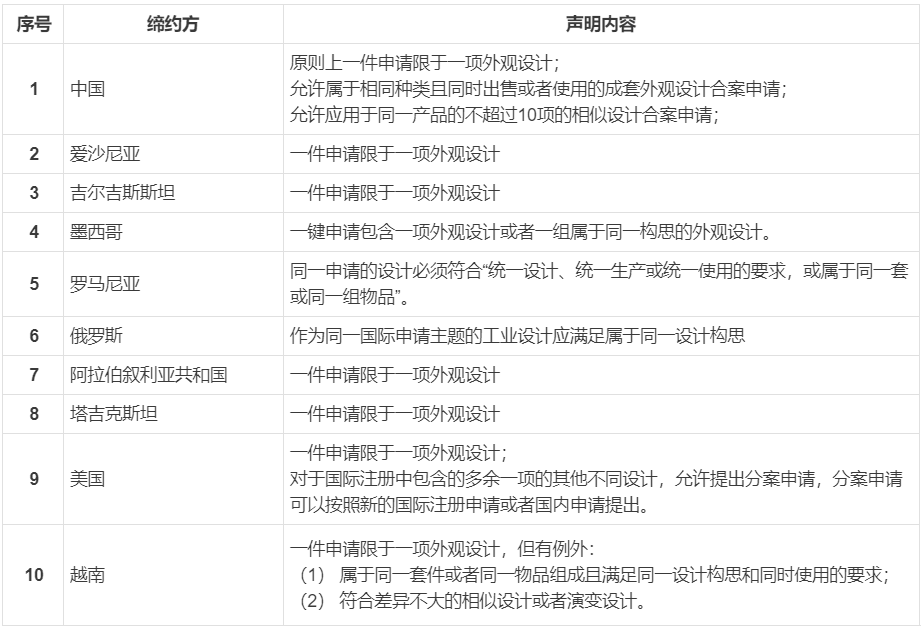 通過海牙體系提交國際注冊申請,一件申請中最多可以包含不超過100項(xiàng)外觀設(shè)計(jì),前提是這些外觀設(shè)計(jì)同屬于同一大類(洛迦諾分類)。不過,并不是所有締約方的法律都放開了合案申請的外觀設(shè)計(jì)的限制。如果根據(jù)其國內(nèi)法律規(guī)定,不允許就不同外觀設(shè)計(jì)進(jìn)行合案或者對(duì)合案數(shù)量有所限制,則該締約方必須提前向國際局提出聲明,下列為目前作出聲明的締約方及其聲明的內(nèi)容: