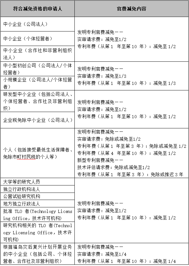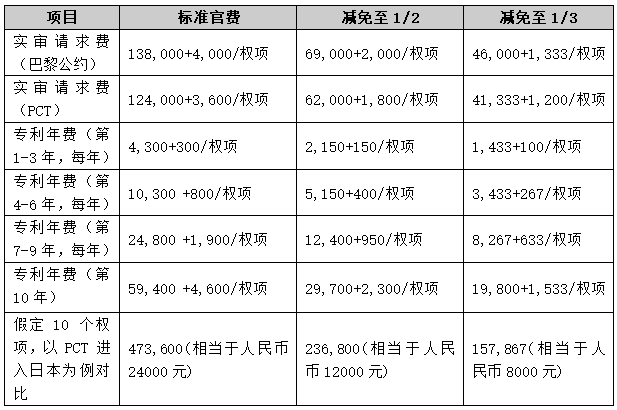 對于在2019年4月1日之后提出實審請求的日本發(fā)明專利申請,其實審請求費和專利年費將按照下表內(nèi)容進行減免:
