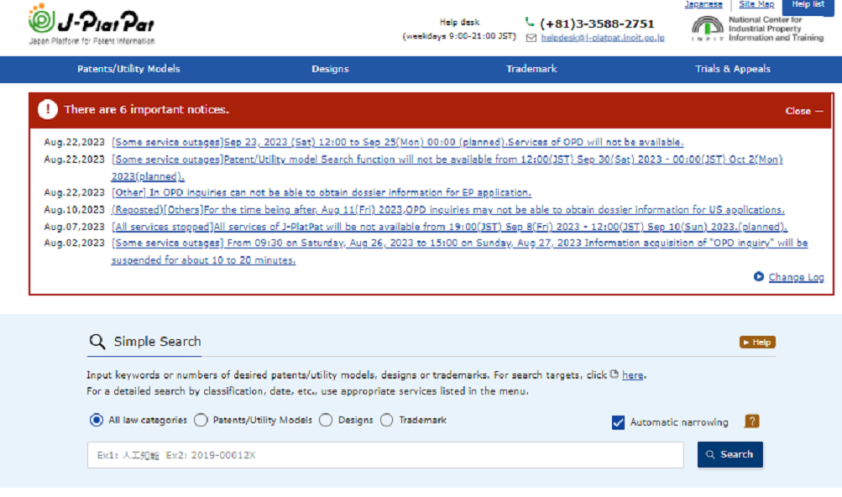 日本專利局將自1885年以來公布的所有日本專利、實用新型和外觀設計電子文獻及檢索系統通過其網站(http://www.jpo.go.jp/)上的工業產權數字圖書館(IPDL)免費提供給全世界的公眾查詢,而2015年3月23日上線了日本專利平臺J-platpat,替代原IPDL系統。J-platpat收錄了1885年以來公布的日本專利、實用新型和外觀設計的信息,提供日文版和英文版兩種語言類型。