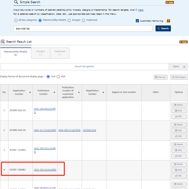 Simple Search能夠檢索出與號碼S64-036726相關的所有專利。由“特開”可知該號碼為發明公開號,因此結尾專利類型應為“A”,可在Search Result List里找到正確的結果應為JP,01-036726,A(1989)。