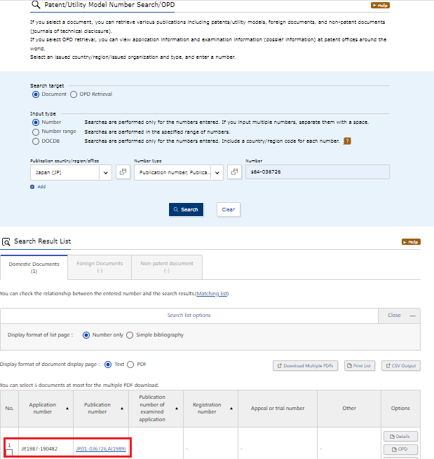 Patent/Utility Model Number Search/OPD能檢索出唯一的結果JP,01-036726,A(1989)。