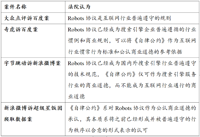 百度訴奇虎“360搜索引擎”案中,法院認為,百度在奇虎發(fā)出修改百度Robots協(xié)議的要求后應(yīng)在合理期限內(nèi)書面告知拒絕修改的合理理由,在百度未明確提出合理理由的情況下,奇虎在《自律公約》簽訂后實施的爬取行為不構(gòu)成不正當(dāng)競爭。
