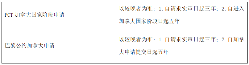 實(shí)審必須在加拿大申請日后四年內(nèi)請求并支付審查費(fèi)。因此,對于PCT國家階段申請,如果該P(yáng)CT申請要求了優(yōu)先權(quán),審查請求可以推遲到進(jìn)入加拿大國家階段后30個月內(nèi)提出。分案申請的規(guī)則有所不同,分案申請可以在母案授權(quán)前一天提交,并且可以提交“多代”分案申請。分案申請的審查請求和費(fèi)用須在最早母案申請日起四年或分案申請“提交日”后三個月內(nèi)(以較晚者為準(zhǔn))提交。