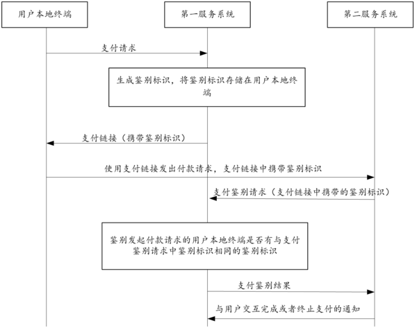 第一服務(wù)系統(tǒng)鑒別發(fā)起所述付款請(qǐng)求的用戶本地終端中是否有與支付鑒別請(qǐng)求中攜帶的鑒別標(biāo)識(shí)相同的鑒別標(biāo)識(shí),并向所述第二服務(wù)系統(tǒng)返回支付鑒別結(jié)果;