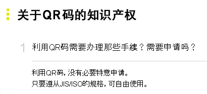 DENSO公司擁有QR Code二維碼的專利權(quán),但明確表示不會行使已形成標準(ISO/IEC 18004)的QR碼相關(guān)權(quán)利2。