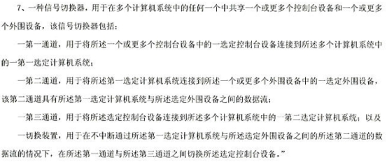 第三,從發明目的來看,本專利所要解決的技術問題是提供一種信號切換器,其在將一個或多個外圍設備切換到不同的計算機系統的同時,不中斷流向所述一個或多個外圍設備的數據流。而對比文件1所要解決的技術問題是提供在多個USB主機之間共享外圍設備,允許多個用戶使用鍵盤、監視器、鼠標和一組USB外圍設備的同時訪問多個計算機,而且同時支持計算機之間的文件傳送裝置,因此,D1中沒有給出關于上述區別技術特征的任何技術啟示。