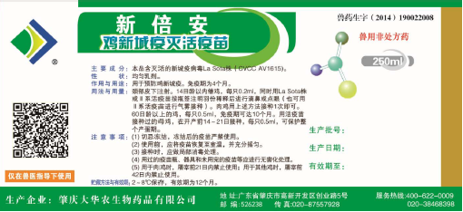 由上圖可見,申請人在實際使用中,無論是商標、商品介紹、主要成分及功能用途等方面均為從左及右的認讀順序,相關(guān)公眾在看到上述標簽時,會認讀為“新倍安 雞新城疫滅活疫苗”,而不會將其中的“新倍安”認讀為“安倍新”或者“新安倍”。