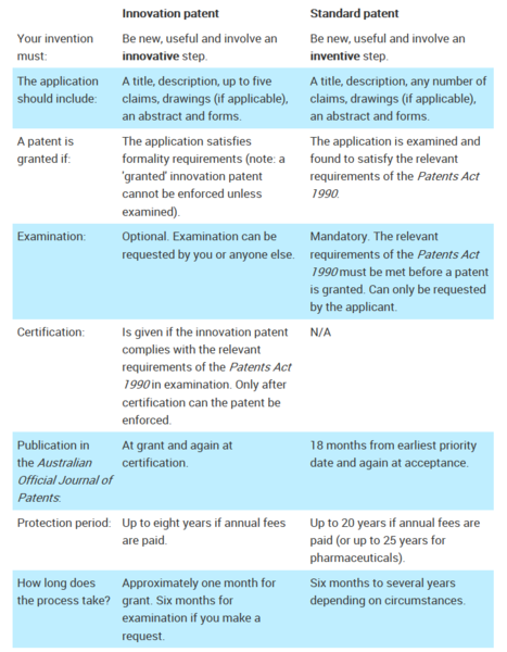 澳大利亞專(zhuān)利分為:標(biāo)準(zhǔn)專(zhuān)利Standard patent(類(lèi)似中國(guó)的發(fā)明)、創(chuàng)新專(zhuān)利innovation patent(類(lèi)似中國(guó)的實(shí)用新型,但也有較多不同之處)、外觀專(zhuān)利。