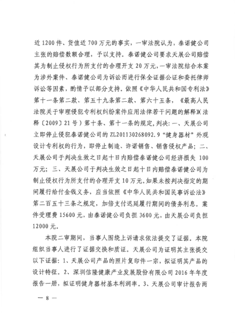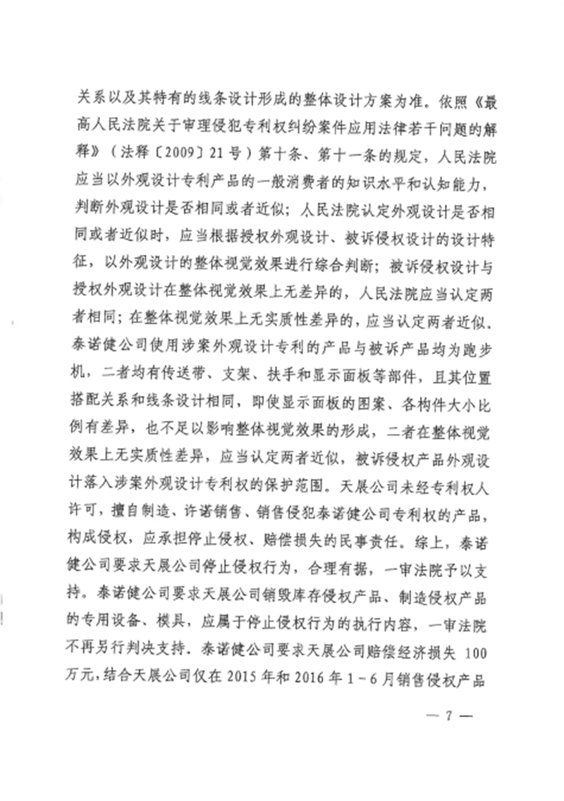 集佳代理意大利泰諾健公司訴山東天展健身器材有限公司(以下簡稱“天展公司”)侵害外觀設計專利權糾紛一案,經濟南中院一審((2016)魯民初1656號)、山東高院二審((2017)魯民終797號),我們已于近日收到由山東高院做出的終審判決。山東高院駁回被告上訴,維持一審判決,認定被告天展公司生產、銷售、許諾銷售的被控侵權跑步機產品落入涉案專利權保護范圍,并支持了原告泰諾健公司主張的停止侵權行為、賠償經濟損失及合理維權費用等請求。