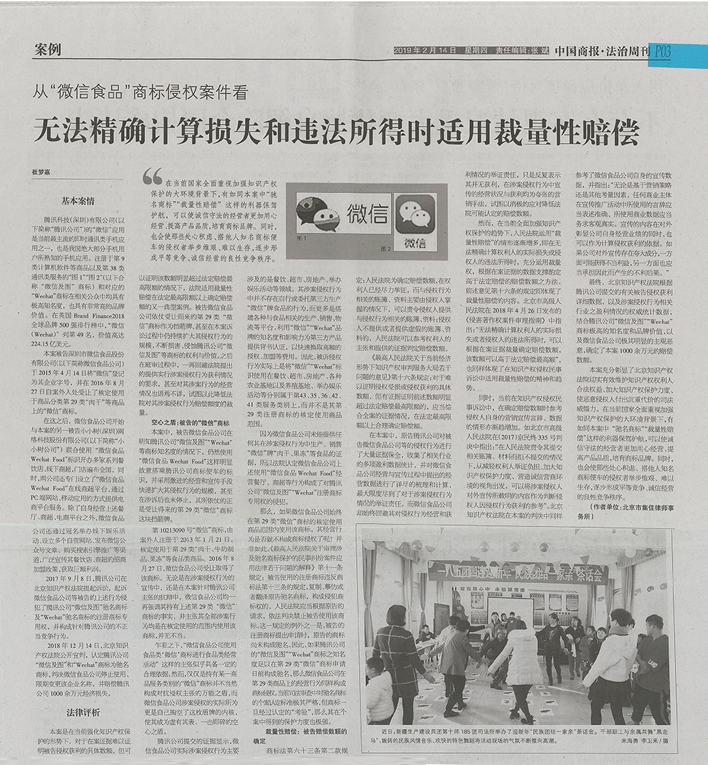 集佳文章《從“微信食品”商標侵權案件看無法精確計算損失和違法所得時使用裁量性賠償》在《中國商報》發表