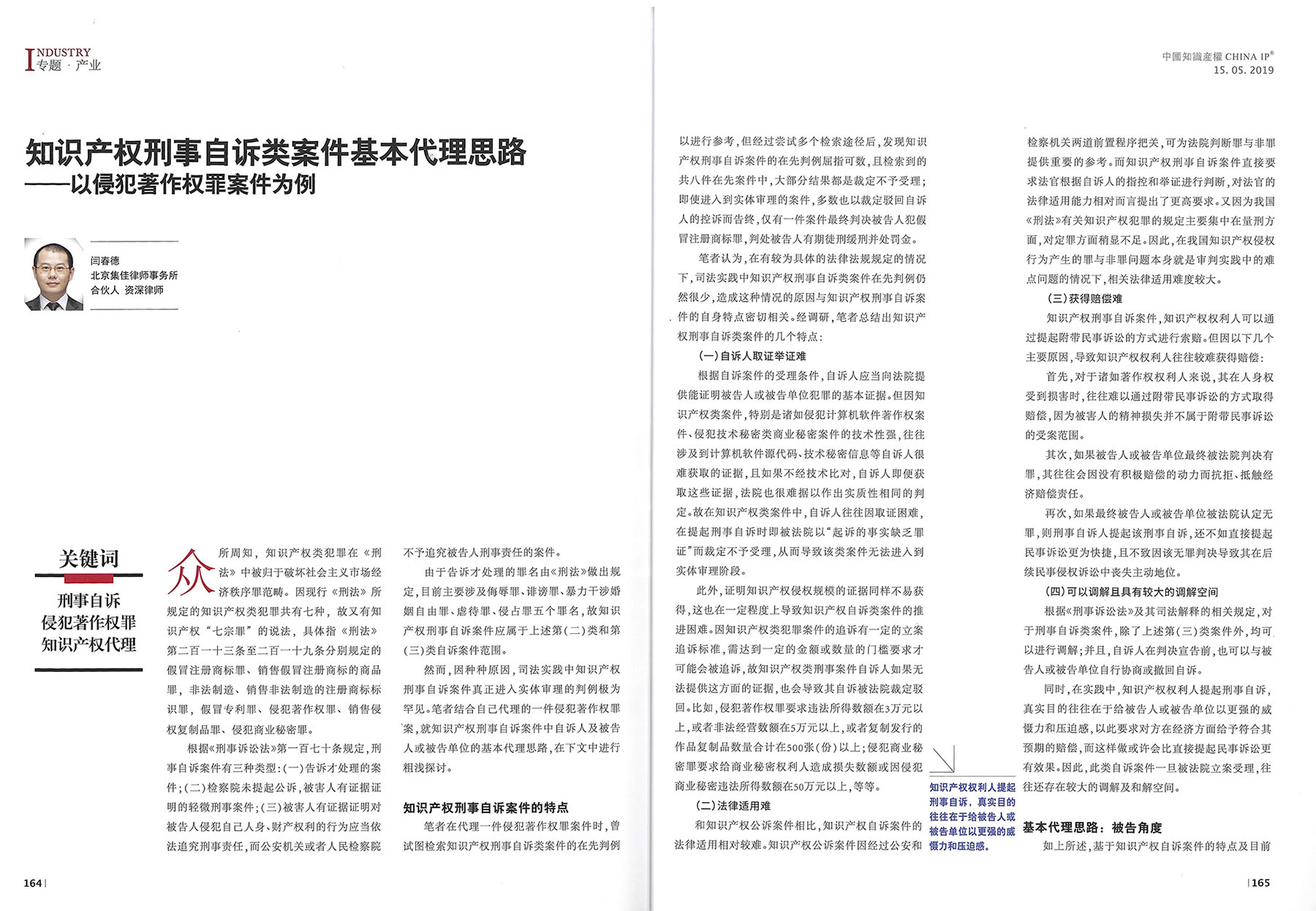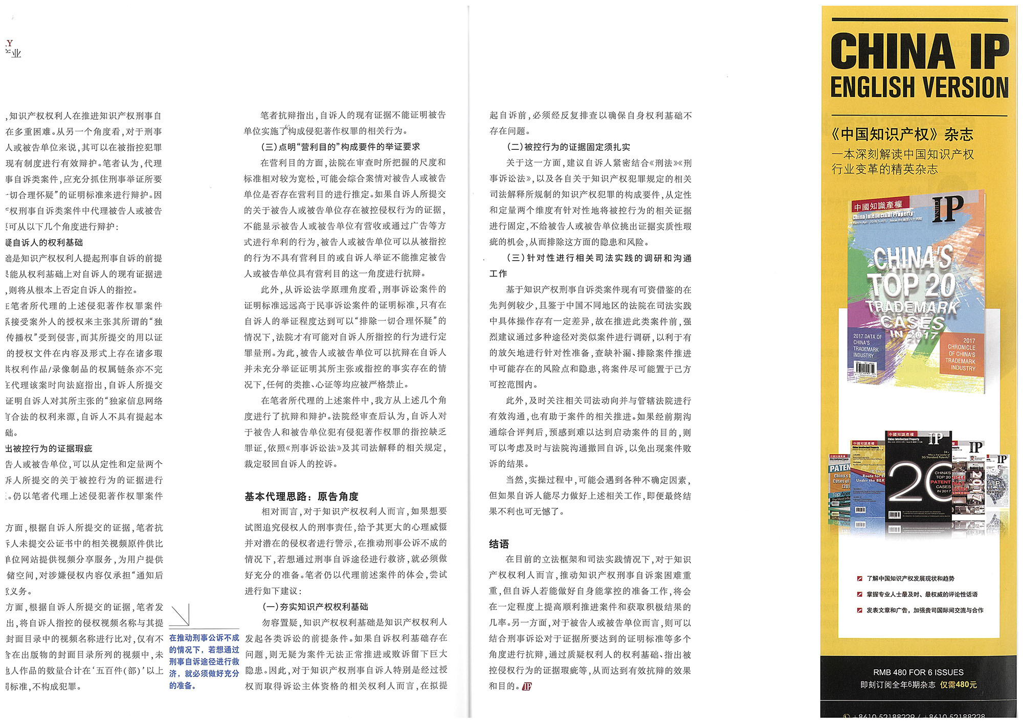 集佳文章《知識(shí)產(chǎn)權(quán)刑事自訴類案件基本代理思路—以侵犯著作權(quán)罪案件為例》在《中國(guó)知識(shí)產(chǎn)權(quán)》發(fā)表