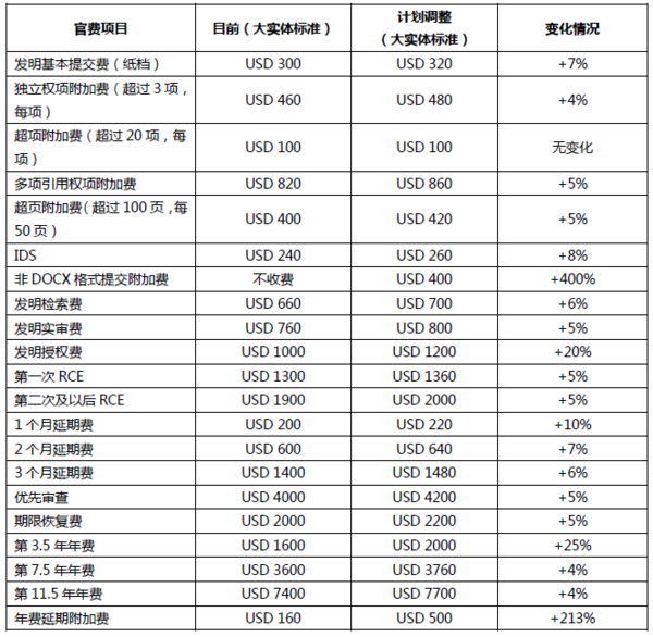 這是美國近三年來首次大范圍上調(diào)官費(fèi),2019年8月初步公告上調(diào)官費(fèi)計(jì)劃時,預(yù)計(jì)是在2021 年1 月實(shí)施,本次公布的最終結(jié)果是提前到2020年10月2日實(shí)施(除非DOCX格式提交附加費(fèi)延后至2022年1月1日實(shí)施外),并對初步計(jì)劃進(jìn)行了略微調(diào)整。