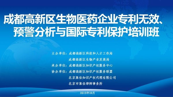 10月24日,由成都高新區(qū)科技和人才工作局、成都高新區(qū)生物產(chǎn)業(yè)發(fā)展局主辦,成都高新區(qū)知識(shí)產(chǎn)權(quán)服務(wù)中心承辦,成都高新區(qū)知識(shí)產(chǎn)權(quán)服務(wù)聯(lián)盟、北京集佳知識(shí)產(chǎn)權(quán)代理有限公司、北京市集佳律師事務(wù)所協(xié)辦的“成都高新區(qū)生物醫(yī)藥企業(yè)專利無效、預(yù)警分析與國際專利保護(hù)培訓(xùn)”在高新區(qū)菁蓉匯順利舉行。本次培訓(xùn)圍繞企業(yè)專利無效、預(yù)警分析、海外專利保護(hù)等熱點(diǎn)問題展開,旨在增強(qiáng)企業(yè)專利保護(hù)能力和意識(shí),助力生物醫(yī)藥企業(yè)海外專利保護(hù)、推動(dòng)生物醫(yī)藥產(chǎn)業(yè)發(fā)展。成都高新區(qū)100 余家知名生物醫(yī)藥企業(yè)、科研院所代表參加培訓(xùn)。