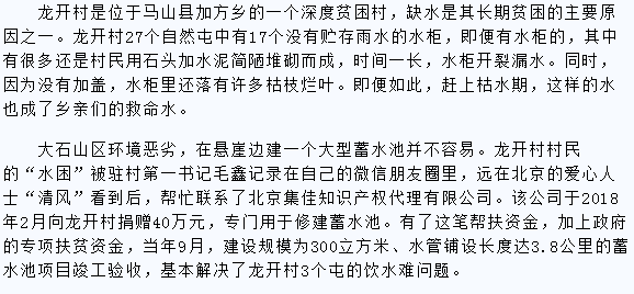 據(jù)了解,龍開村是目前南寧市僅剩的10個因脫貧指標(biāo)未達(dá)標(biāo)而沒脫貧摘帽的深度貧困村之一。該村山多地薄水少,由于季節(jié)性缺水,飲水困難、飲水衛(wèi)生的問題成為影響當(dāng)?shù)卮迕窕旧畹淖钔怀鰡栴},并深刻制約了當(dāng)?shù)氐慕?jīng)濟(jì)發(fā)展。2018年,北京集佳知識產(chǎn)權(quán)有限公司了解到這一情況之后,積極幫助龍開村出主意想辦法,并捐贈40萬元,在龍開村仲團(tuán)屯修建了蓄水池工程,徹底解決了多年來長期困擾三個屯村民的飲水難問題,并改善了農(nóng)業(yè)生產(chǎn)條件,為當(dāng)?shù)卮迕窆悦撠毺峁┝诵判暮拖M?019年5月13日,龍開村黨支部第一書記毛鑫等一行4人代表村民為集佳贈送“愛心傾注龍開蓄水池,精準(zhǔn)扶貧深度貧困村”錦旗,表達(dá)了龍開村民的真誠謝意。