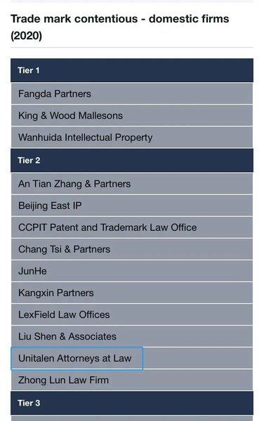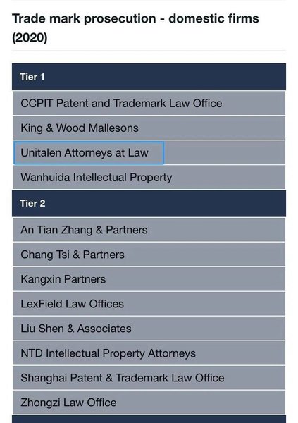 近日,全球領先的權威知識產(chǎn)權媒體《知識產(chǎn)權管理》(Managing Intellectual Property,MIP)公布了2020年商標業(yè)務的知識產(chǎn)權之星排行榜,集佳再次蟬聯(lián)商標申請及確權領域(Trademark Prosecution)排行榜第一梯隊,并榮登商標保護及訴訟領域(Trademark Contentious)排行榜第二梯隊。