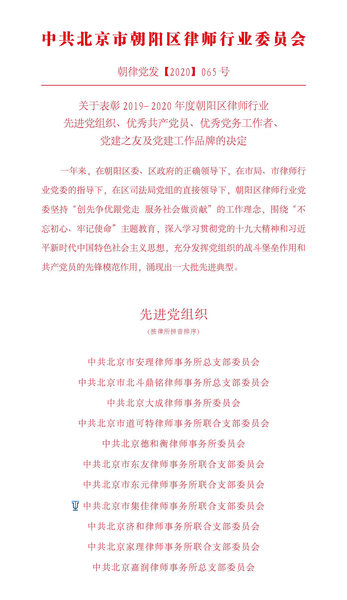 7月1日,在慶祝中國(guó)共產(chǎn)黨成立99周年之際,中共北京市朝陽(yáng)區(qū)律師行業(yè)委員會(huì)下發(fā)文件表彰2019-2020年度朝陽(yáng)區(qū)律師行業(yè)先進(jìn)黨組織及個(gè)人,集佳律所黨支部被授予“先進(jìn)黨組織”光榮稱號(hào)。