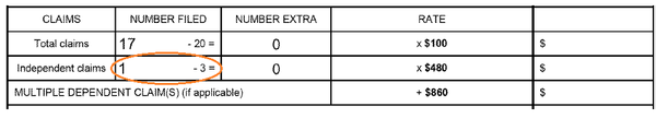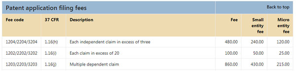 其中大部分項(xiàng)目的費(fèi)用是固定的,僅取決于申請(qǐng)人的規(guī)模是大實(shí)體、小實(shí)體還是微實(shí)體。有一定操作空間的是申請(qǐng)?zhí)峤粫r(shí)的費(fèi)用(patent application filing fees),其中與權(quán)利要求相關(guān)的主要是以下幾條: