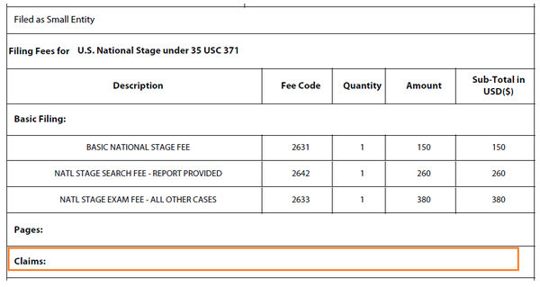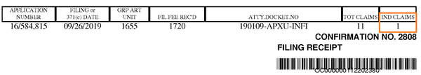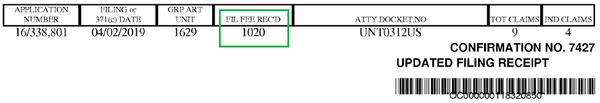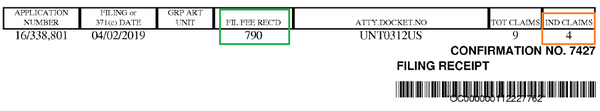 在USPTO發(fā)出的受理通知書(shū)上,可以看到官方認(rèn)定的獨(dú)立權(quán)利要求數(shù)為4,同時(shí)顯示官方收到的申請(qǐng)人費(fèi)用(綠色方框),參見(jiàn)下圖: