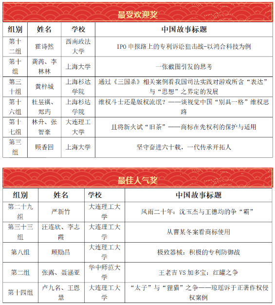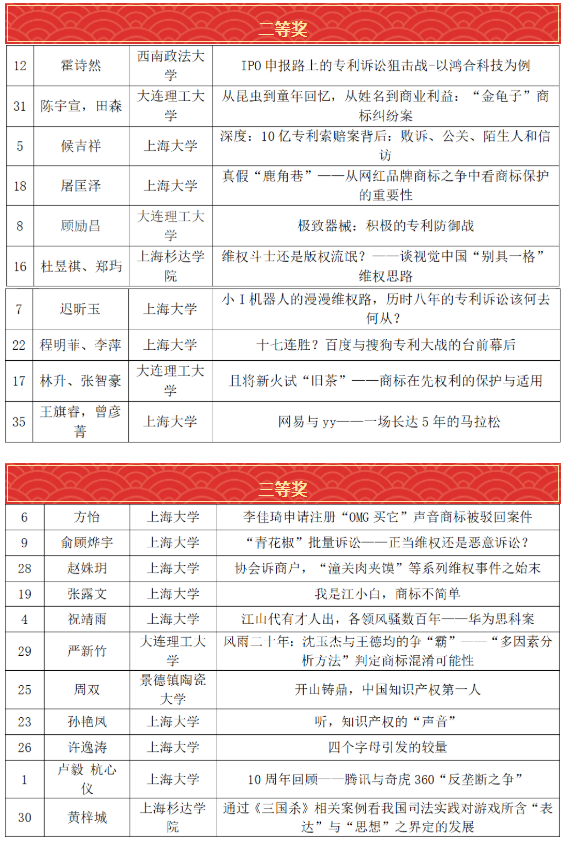 由集佳律所上海分所贊助、上海大學法學院/知識產權學院主辦的首屆“知識產權?中國故事”撰寫比賽,經過參賽作品展示、入圍初選、專家評審以及決賽答辯等環節的激烈角逐,于2022年3月26日在上海大學圓滿落下帷幕,來自上海大學、大連理工大學、西南政法大學、上海杉達學院、廈門大學、內蒙古財經大學、景德鎮陶瓷大學和華中師范大學的35組本科生及研究生摘奪了35個專業獎項。