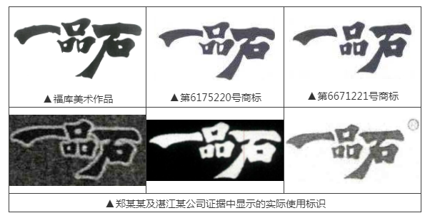 2007年7月,廣東省湛江市居民鄭某某在“電壓力鍋”等廚房器具商品上申請(qǐng)注冊(cè)第6175220號(hào)“一品石”商標(biāo),并于同年8月成立湛江市某公司。2008年4月,鄭某某又申請(qǐng)注冊(cè)另一枚第6671221號(hào)“一品石”商標(biāo),該枚商標(biāo)的字形與前一枚商標(biāo)略有變化,著作權(quán)圖樣及涉案相關(guān)標(biāo)識(shí)如下附圖所示: