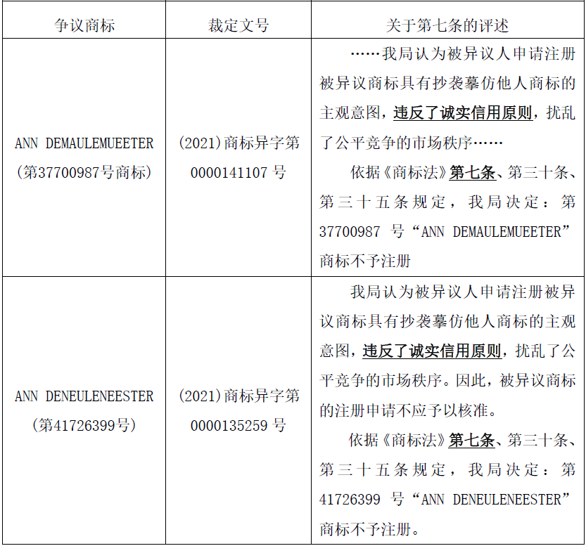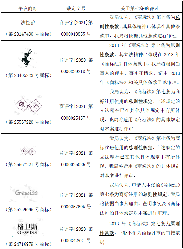 而在過往大多數(shù)異議、無效宣告案件中,“誠實信用原則”都被評價為“總則性條款”或“原則性條款”,例如,下表所列的6件無效宣告案件均將申請人基于第七條的評審請求評述為“總則性條款”,認(rèn)為誠實信用原則具體精神已體現(xiàn)在其他條款中,案件需依據(jù)其他具體性條款進(jìn)行評價: