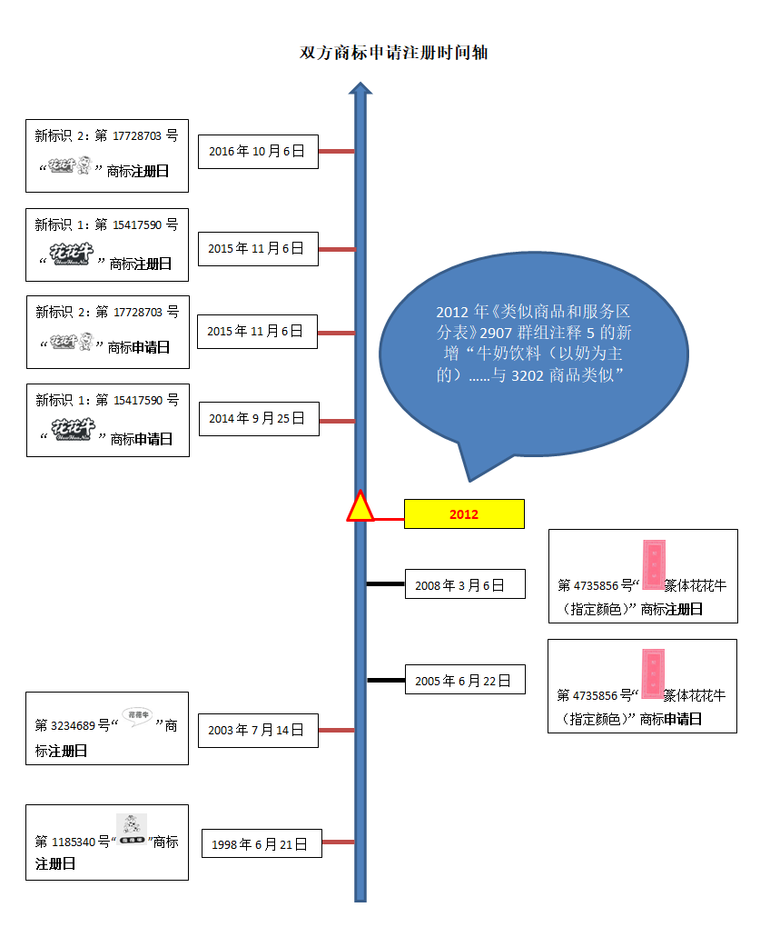 篆體花花牛(指定顏色)”商標挑戰花花牛新標識“圖片”“圖片”在牛奶飲料(以牛奶為主)商品項目上的注冊,導致上述兩個新標識在“牛奶飲料(以牛奶為主)”商品項目上的無效。同時,河南鄭牛還持續以普通花花牛字體在和花花牛乳業公司主營商品項目相同、類似或者高度關聯的商品項目上申請注冊商標,雙方隨即陷入持續數年的商標確權僵局。