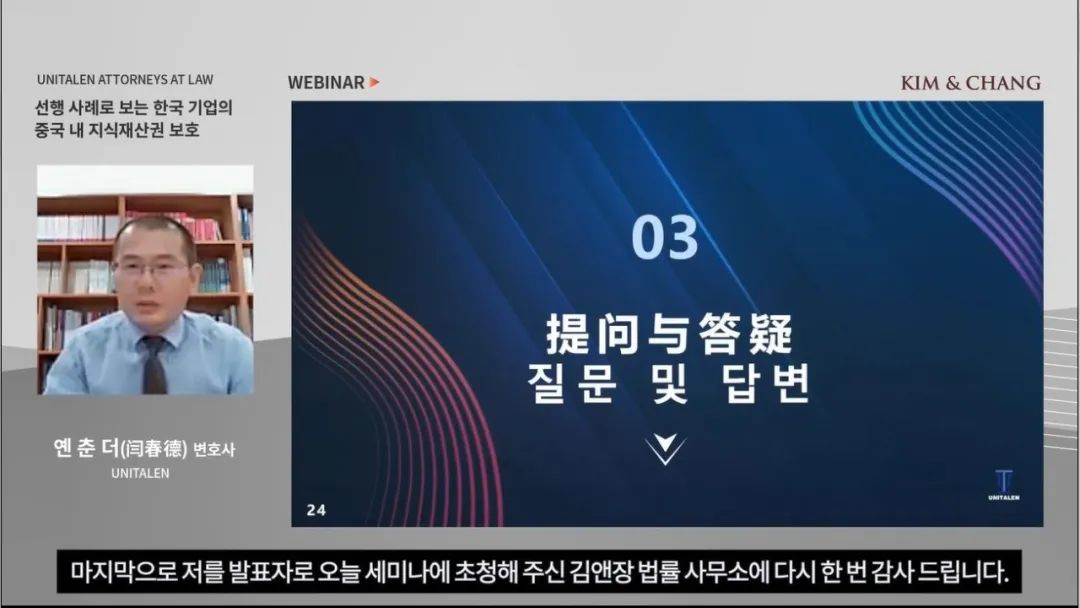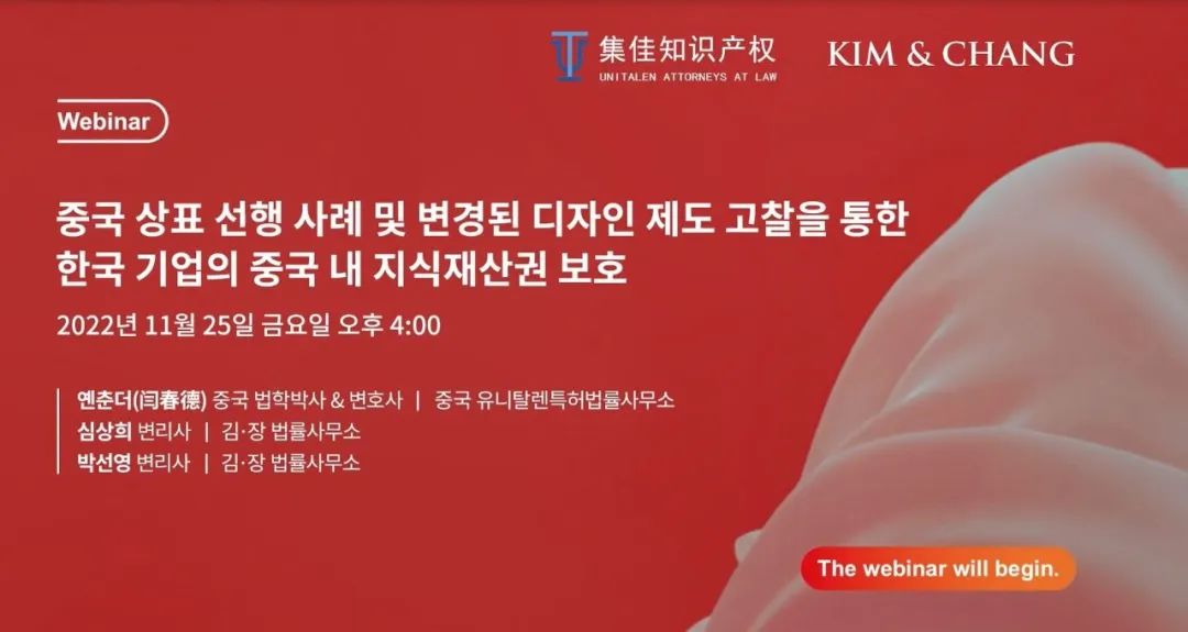 應韓國金張律師事務所邀請,2022年11月25日,集佳合伙人閆春德律師通過網絡研討會形式,為韓國企業作“韓企在華知識產權維權”專題講座。合伙人鄭毅律師全程參與本次講座與韓方的溝通與組織協調工作。