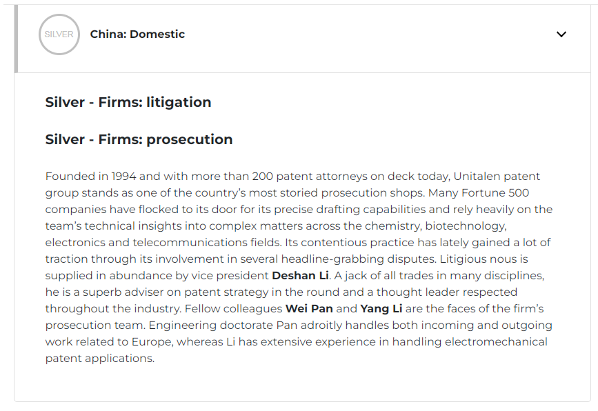 IAM PATENT 1000專注于在全球范圍內(nèi)推薦一流的專利事務(wù)所與專利專家,為全球?qū)@麖臉I(yè)人員提供了權(quán)威的價值參考。其調(diào)研人員駐香港及英國倫敦,每年歷時五個月針對全球數(shù)十個國家/地區(qū)的1800余位律師、專利代理人和公司法務(wù)開展調(diào)研,涉及專利申請、專利許可、專利商業(yè)化以及專利訴訟等領(lǐng)域,通過業(yè)內(nèi)同行及客戶的評價反饋,評選出榜單,對各國優(yōu)質(zhì)的知識產(chǎn)權(quán)律所進行客觀獨立的評價與推薦。
