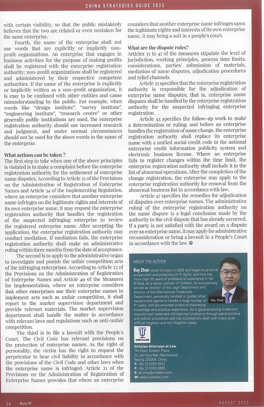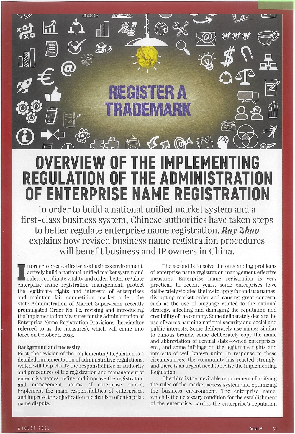 集佳合伙人趙雷律師文章《Overview of the Implementing Regulation of the Administration of Enterprise Name Registration》在《Asia IP》發表