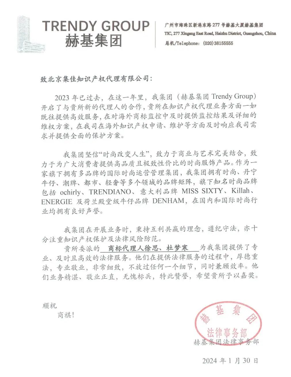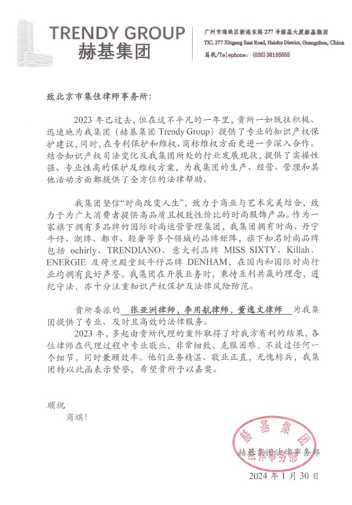 信中提到,2023年,集佳與赫基集團在專利保護和維權(quán)、商標維權(quán)方面更進一步加強合作,集佳一如既往、迅速地為赫基集團提供了專業(yè)的知識產(chǎn)權(quán)保護建議,集佳提供的實操性強、專業(yè)性高的保護及維權(quán)方案,為赫基集團的生產(chǎn)、經(jīng)營、管理和其他活動方面都提供了全方位的法律幫助。赫基集團法務(wù)部贊揚集佳張亞洲律師、李用航律師、董逸文律師、徐思律師、商標代理人杜夢寒等,在提供專業(yè)、及時且高效的法律服務(wù)的過程中,厚德重法,業(yè)務(wù)精湛,敬業(yè)正直,無愧標兵。