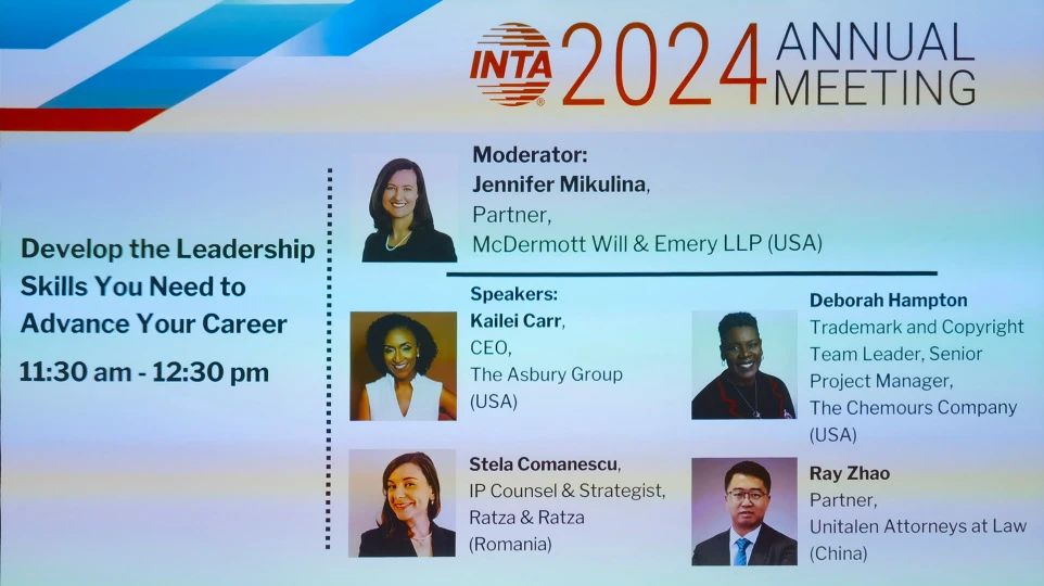 2024年5月20日下午(美國(guó)亞特蘭大當(dāng)?shù)貢r(shí)間),國(guó)際商標(biāo)協(xié)會(huì)(INTA)146屆年會(huì)領(lǐng)導(dǎo)力專家論壇在美國(guó)亞特蘭大佐治亞世界會(huì)議中心順利舉行,集佳合伙人趙雷律師受邀出席,并就develop the leadership skills you need to advance your career主題,在美國(guó)律師Jennifer Mikulina女士主持下,與其他三位來(lái)自美國(guó)和羅馬尼亞企業(yè)的專家發(fā)表精彩演講與分享。
