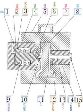 一種液壓開孔器,包括油泵、油管、開有可容納鋼軌的空腔的機體、安裝于機體內的油缸、設于油缸內的活塞和活塞桿、位于空腔一側的擠孔陽模、位于空腔另一側的擠孔陰模、出料孔,所述擠孔陽模安裝于活塞桿前端,活塞桿、擠孔陽模、擠孔陰模三者的中心線在同一條直線上,其特征在于:所述機體為下端封閉的環(huán)狀結構,開有可容納鋼軌的空腔位于機體中部。