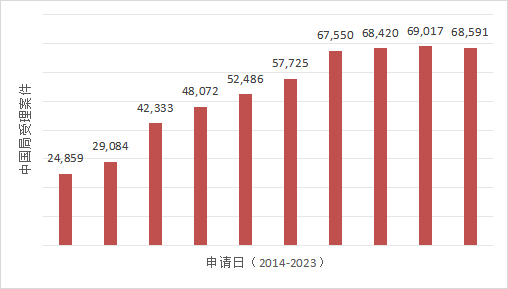 圖1 中美日歐PCT國際階段受理趨勢(2013-2023)