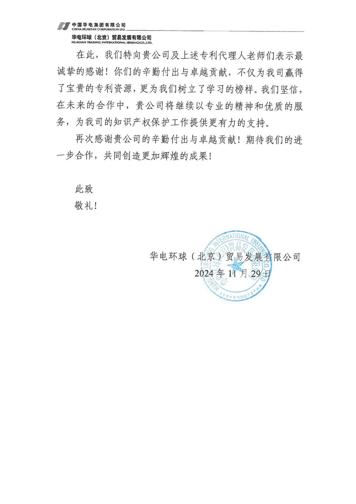 近日,集佳收到客戶華電環(huán)球(北京)貿(mào)易發(fā)展有限公司的感謝信,對集佳在知識(shí)產(chǎn)權(quán)申報(bào)與保護(hù)工作中給予的專業(yè)指導(dǎo)與大力支持表示由衷感謝,同時(shí)對集佳孫越、馬小青、王偉力、李上、王榮鑫等專業(yè)人員在專利代理工作中所展現(xiàn)出的專業(yè)精神與卓越成就表示高度贊揚(yáng)!