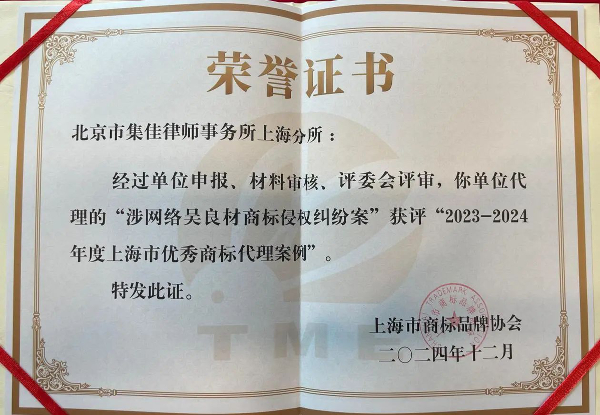 案例一“涉網絡吳良材商標侵權糾紛案”被評為上海市優秀商標代理案例