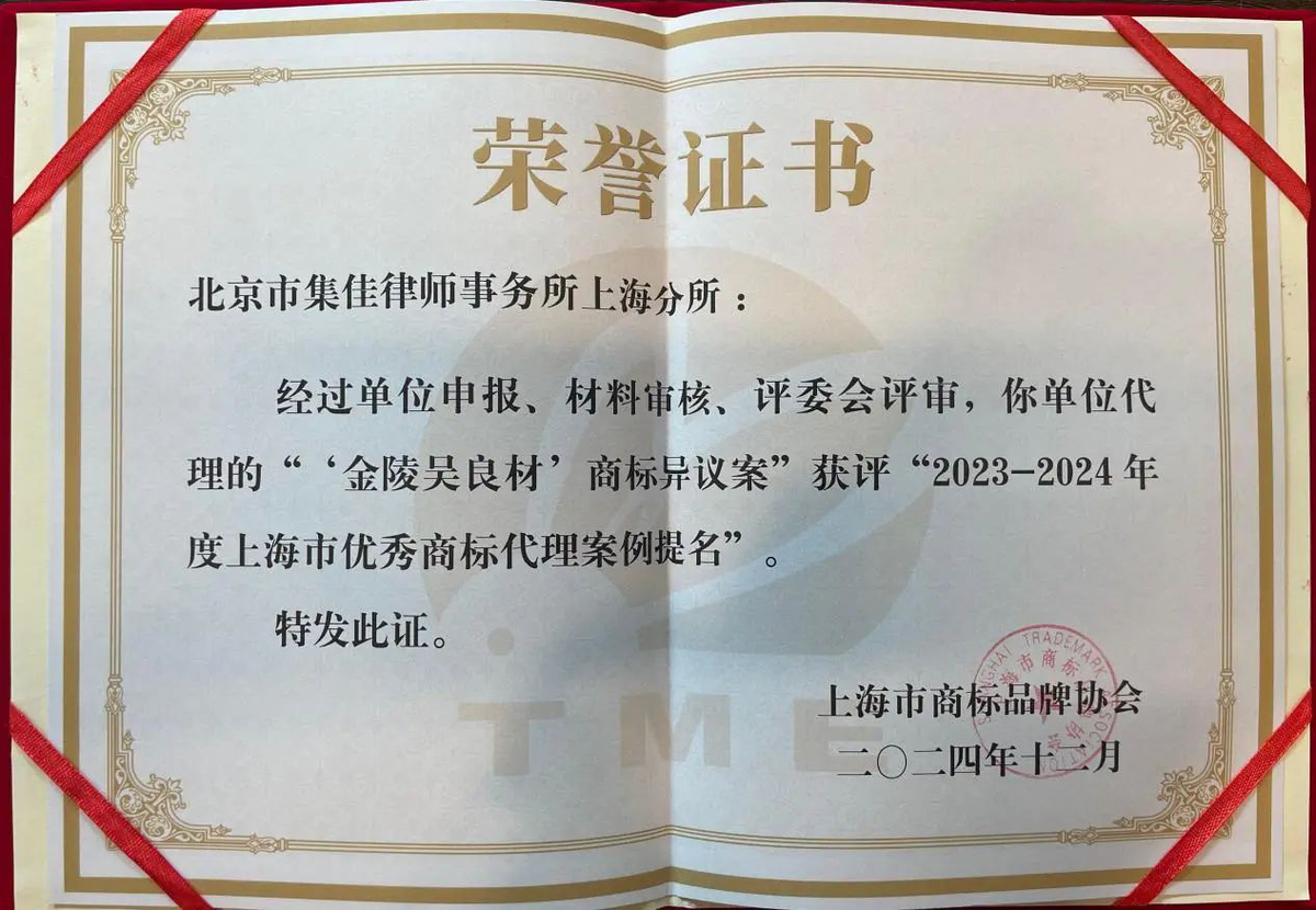 案例二“金陵吳良才商標異議案”被評為上海市優秀商標代理案例提名